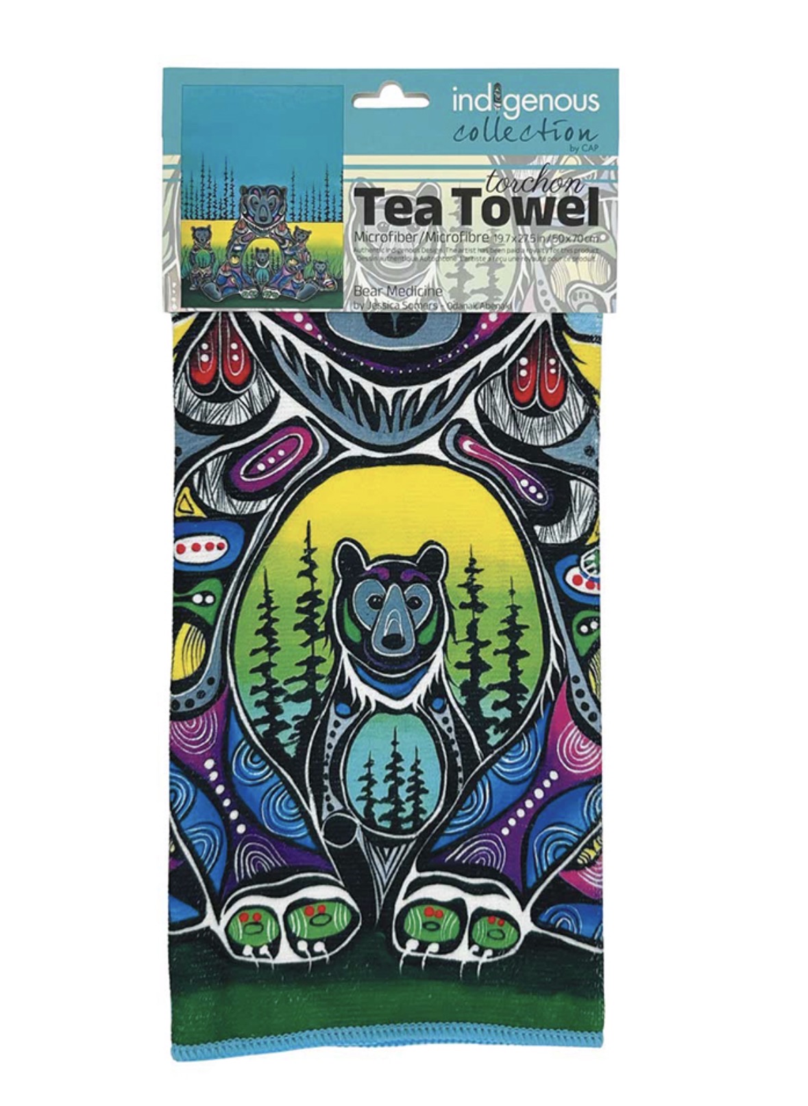 Bring good medicine into your kitchen with the **Bear Medicine Tea Towel**. Featuring the vibrant Woodland art of Jessica Somers, this 19.7″ × 27.5″ towel combines cultural beauty with everyday utility.