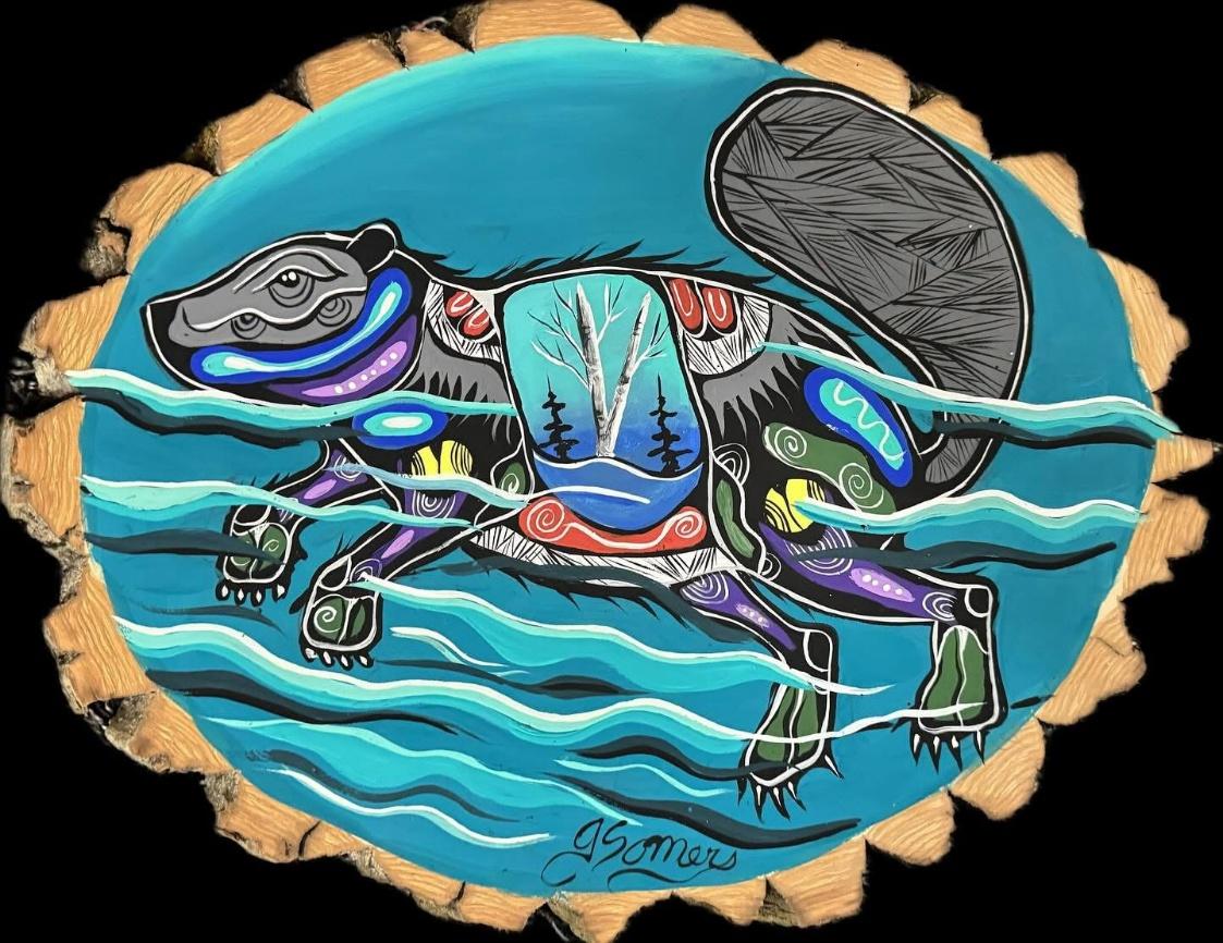 Build a foundation of wisdom in your home with **Beaver Swimming on Wood**. This original, hand-painted artwork by Jessica Somers depicts the industrious Beaver (Amik) gliding through the water on a rustic slice of kiln-dried balsam poplar.