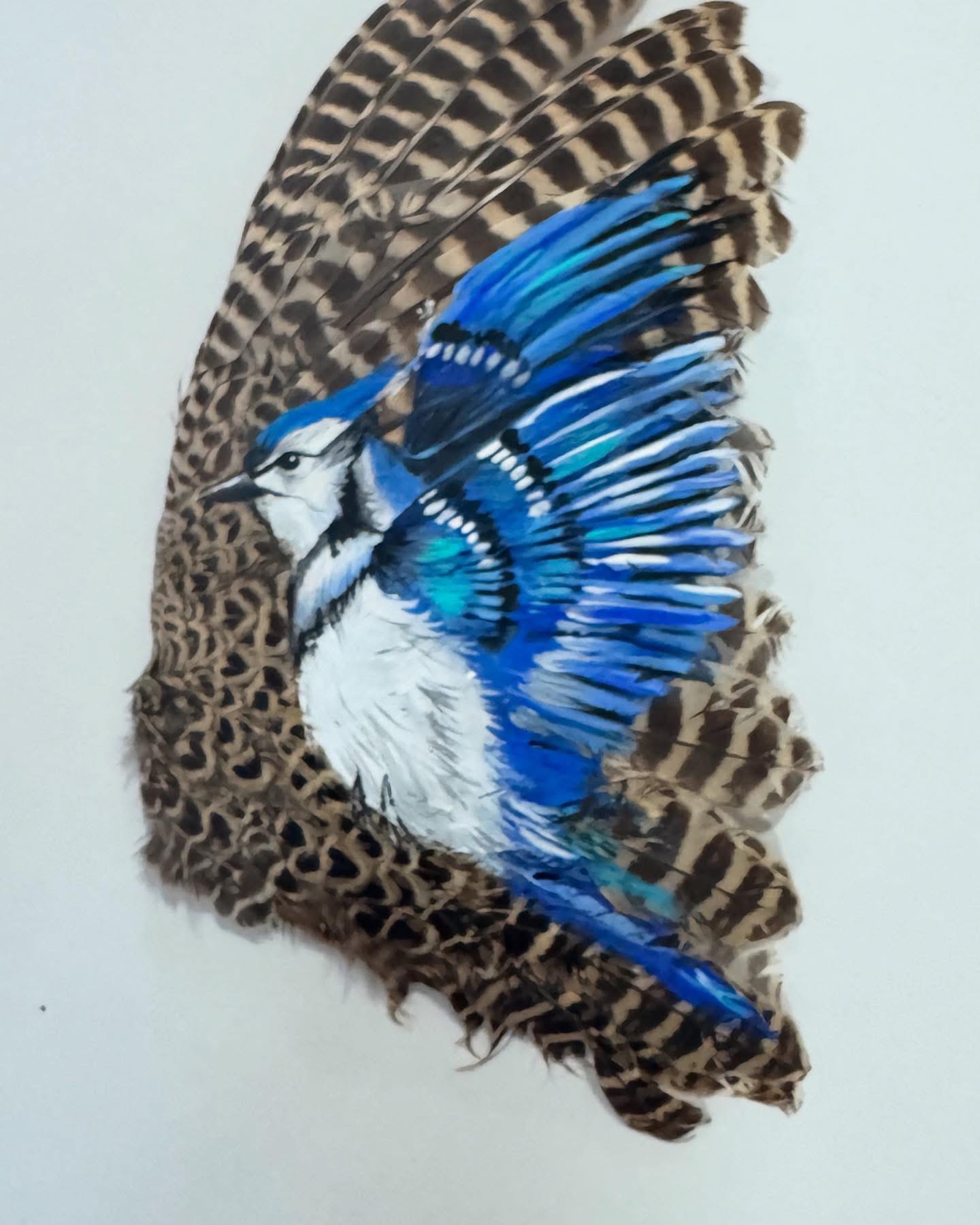 Jessica Somers creates a stunning visual contrast in this piece. The electric blues and whites of the painted Jay pop against the natural, earthy mottling of the preserved Grouse wings. This mixed-media approach honors the organic beauty of the canvas while showcasing the bold strokes of the Woodland style. It is a piece that demands attention, much like the bird itself.
