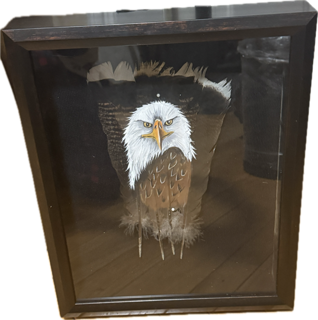 Eagle Framed Feathers is a powerful 11×14″ mixed-media piece by Jessica Somers. Featuring a majestic Eagle hand-painted on ethically sourced turkey feathers, this artwork embodies the teachings of vision, courage, and spiritual connection, reminding us to rise above and see clearly.