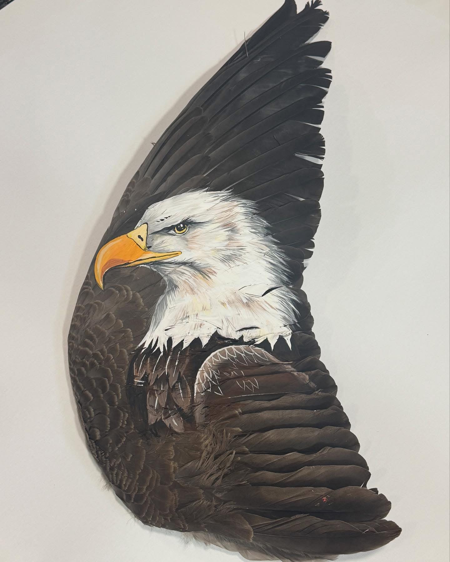 Eagle Framed Goose Wing is a majestic 16×30″ mixed-media masterpiece by Jessica Somers. This rare piece features a striking Eagle hand-painted on a preserved Goose wing, merging the medicines of Vision and Leadership into a powerful symbol of connection to the Spirit World.