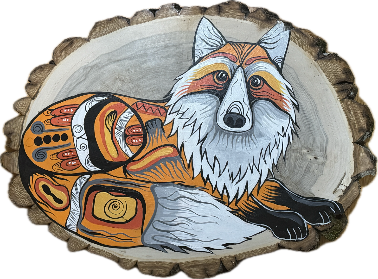 Navigate your path with the clever guidance of **Fox on Wood**. This original, hand-painted artwork by Jessica Somers features the vibrant, observant Fox (Waagosh) on a rustic slice of kiln-dried balsam poplar.