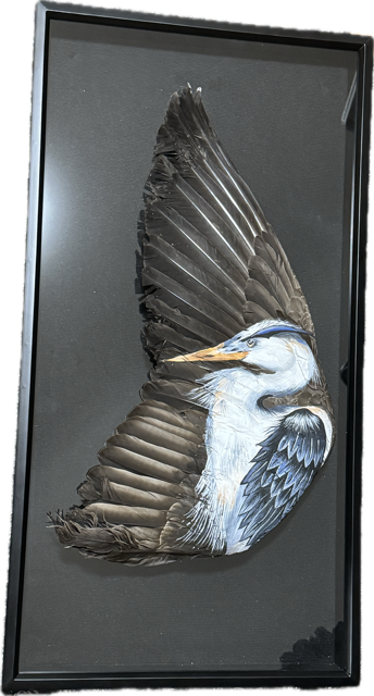 Heron Framed Goose Wing is a serene 16×30″ mixed-media masterpiece by Jessica Somers. A graceful Great Blue Heron is hand-painted directly onto a preserved Goose wing, creating a stunning visual meditation on patience, balance, and the wisdom found in stillness.