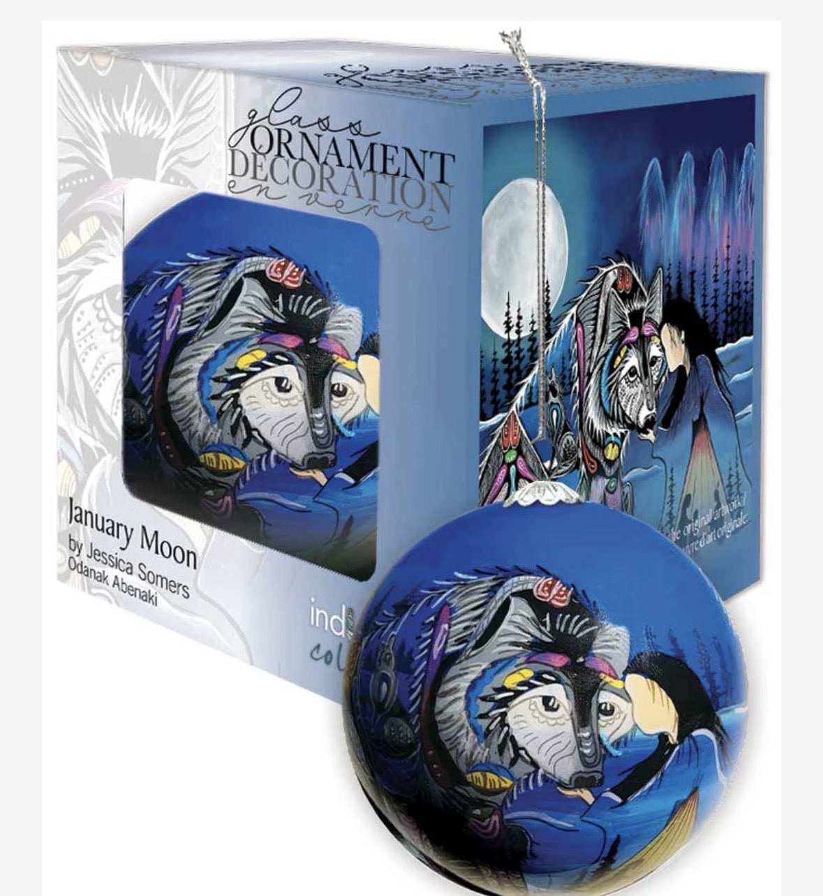 Honor the silence of the winter season with the **January Moon Ornament**. This exquisite glass keepsake features Jessica Somers’ interpretation of the Spirit Moon (Manidoo Giizis).