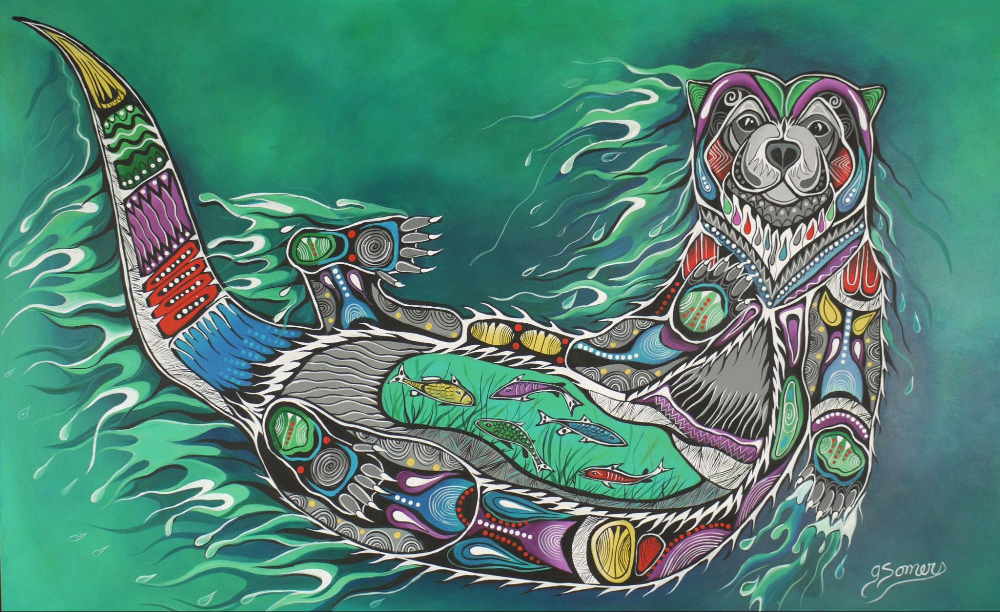 Jessica Somers uses the fluid lines and bold colors of the Woodland style to bring the energy of the water to life. The composition surrounds the Otter with flowing currents and organic shapes, symbolizing the harmony between the creature and its environment. The vibrant design captures the essence of movement, making the joy of the Otter feel tangible and present in the room.