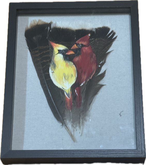 Two Cardinal Framed Feathers is a romantic 11×14″ mixed-media piece by Jessica Somers. Featuring a male and female Cardinal hand-painted together on ethically sourced turkey feathers, this artwork is a beautiful tribute to partnership, balance, and the enduring strength of a shared journey.