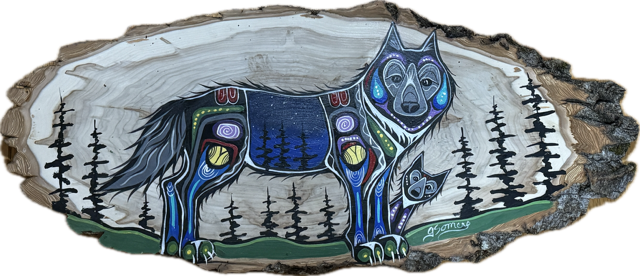 Honor the sacred bond of the pack with **Wolf and Baby on Wood**. This original, hand-painted artwork by Jessica Somers depicts a Wolf (Ma’iingan) and its pup on a rustic slice of kiln-dried balsam poplar.